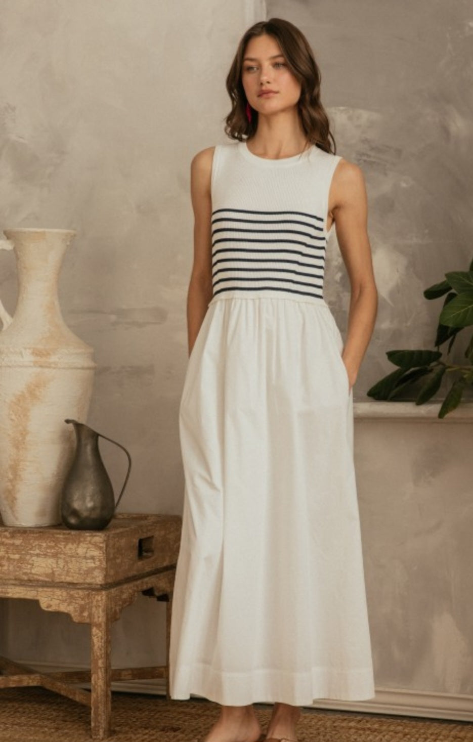Striped ribbed tank detail with pockets.