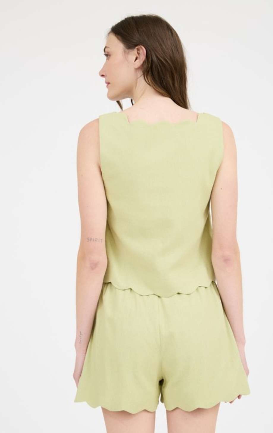 Square scallop trim top with high waist scalloped trim mini shorts.