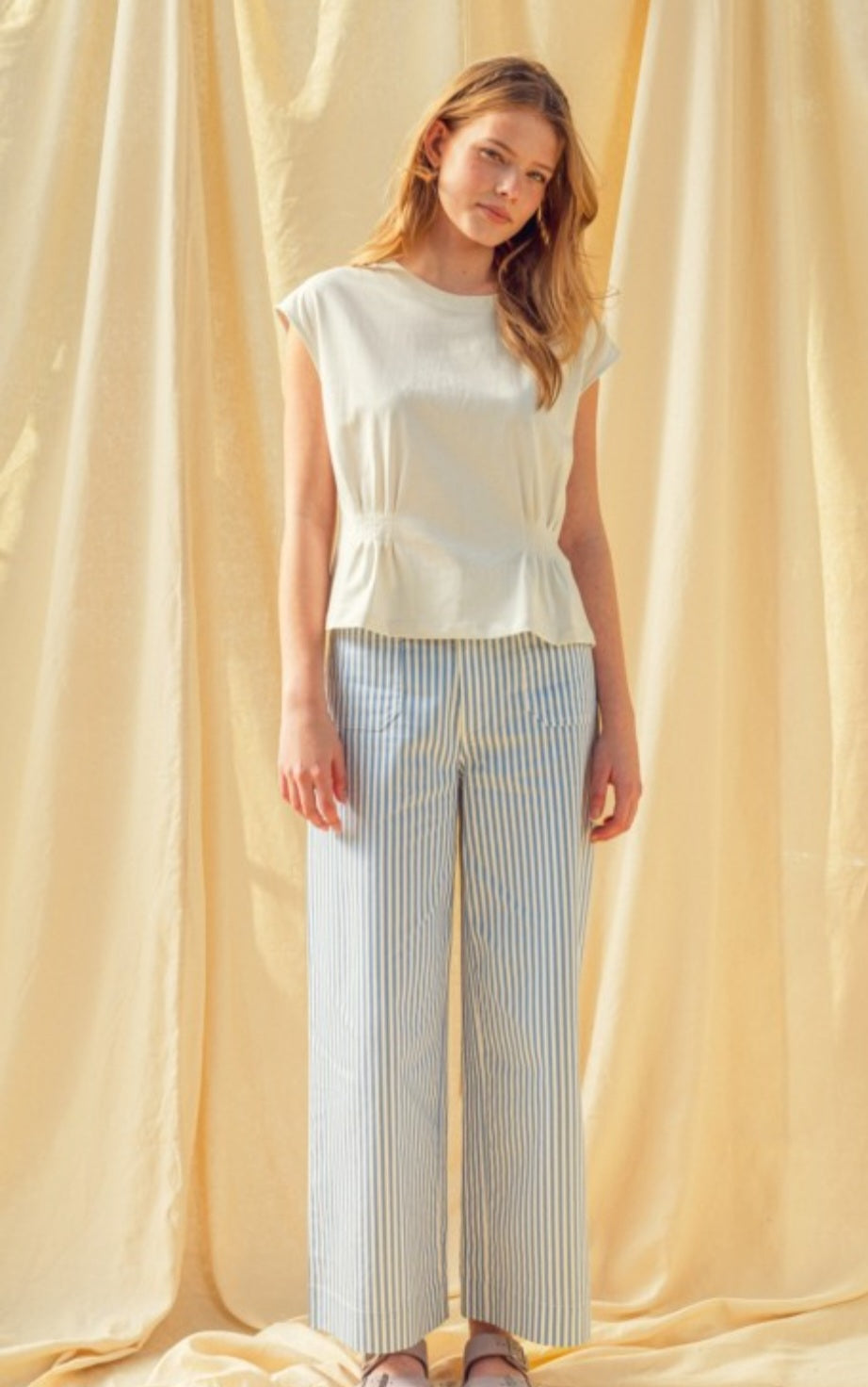 Round neck waist detailed cap sleeve top.