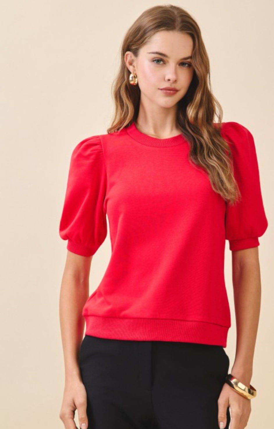 Red Crew Neck Puff Sleeve Knit Top