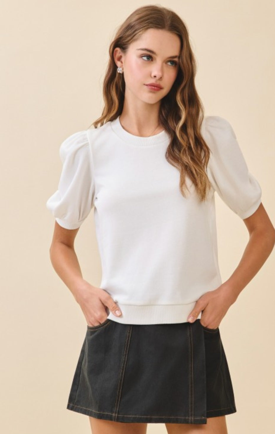 White Crew Neck Puff Sleeve Knit Top