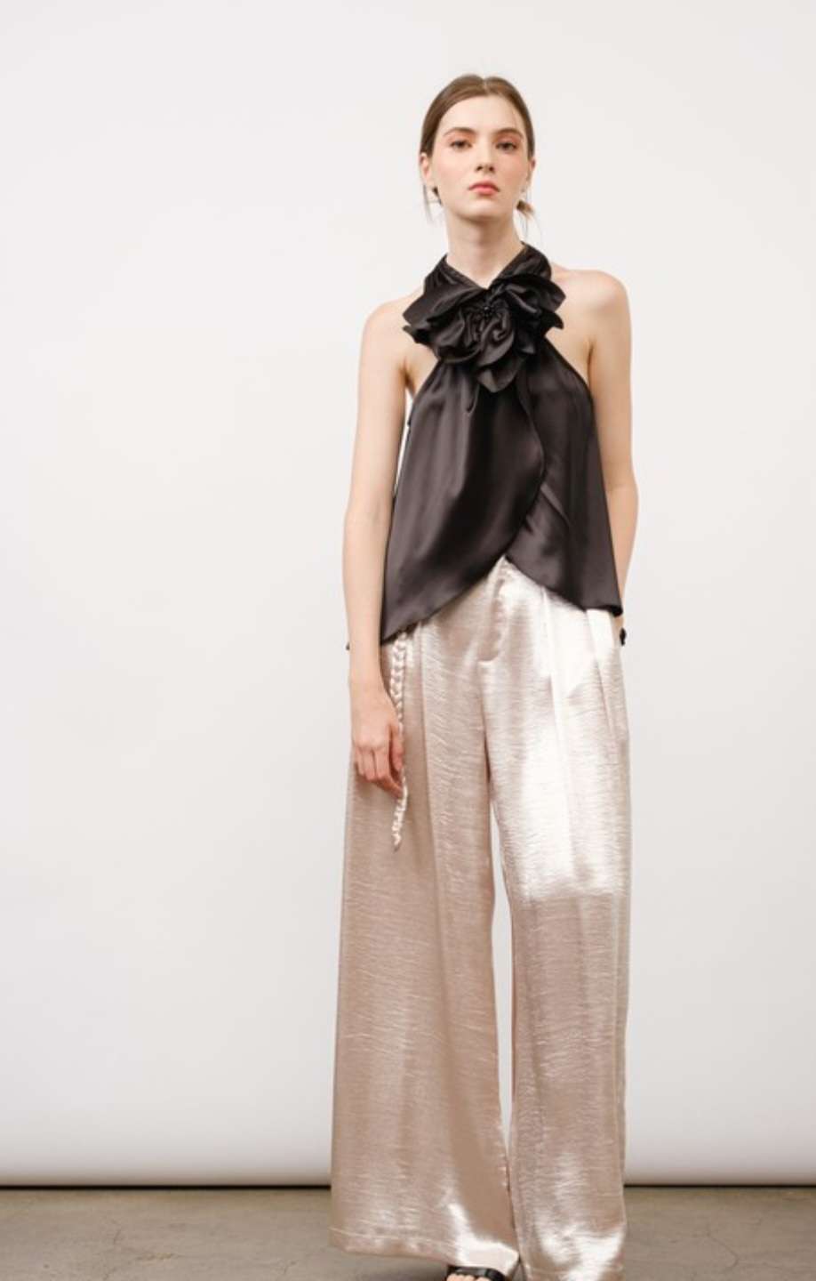 Satin Sleeveless Halter Neck Front 3D Flower Top Back neck slit and button loop closure.